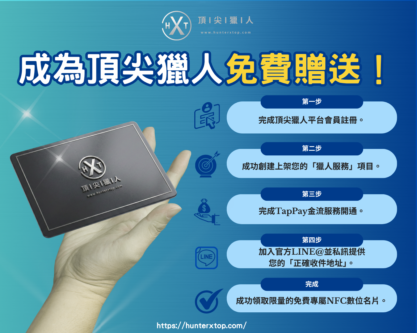 現在透過連結註冊 「頂尖獵人」,不僅能免費使用功能強大的「一站式數位服務名片」,整合你的作品集與商城,完成註冊還加碼送你「服務名片NFC實體卡」!
